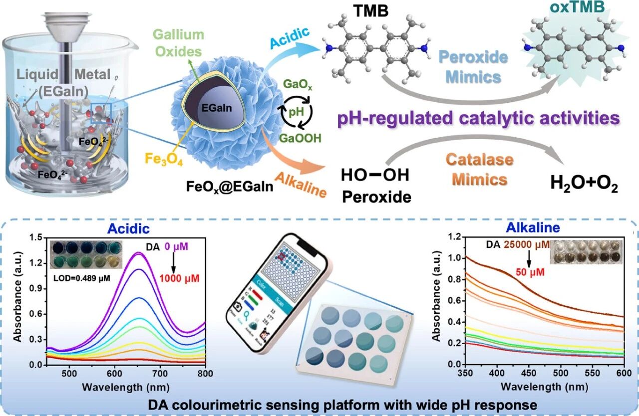 液态金属(LM)具有独特的可逆形貌和可调电子性能,已成为设计先进纳米酶的有前途的平台。纳米酶中的催化活性通常高度依赖于环境 pH 值。本文设计了一种具有 pH 可切换酶活性的磁性 LM 缓冲氧化铁纳米酶(FeOx@EGaIn),其中 LM 作为电子传递底物,有效提高了催化效率。由于氧化铁在酸碱体系中不同的氧化形式和局部电子性质,FeOx@EGaIn 纳米酶在酸性条件下表现出优异的过氧化物酶(POD)催化活性(Km = 2.12 mM,vmax = 1.96 × 10−6 M s−1),在中性至碱性条件下转变为过氧化氢酶活性(CAT),催化稳定性高。而其独特的磁响应能力为催化剂回收提供了更方便的可能性。此外,纳米酶的可切换酶活性为生物传感应用提供了新途径,特别是在检测广泛的 pH 响应性生物分子方面。以液态金属纳米酶为比色传感平台,对生物分子进行动态检测,揭示了电子微环境在调控纳米酶催化活性中的关键作用,也拓展了液态金属在催化、传感检测和生物医学领域的应用前景。