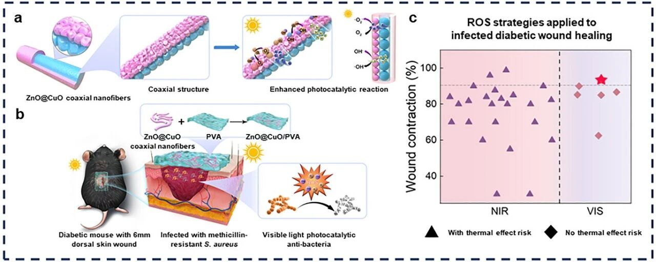 感染性伤口的愈合,尤其是合并糖尿病等基础疾病的患者,始终是临床实践中的一大难题。传统抗生素治疗面临耐药性风险,而其他依赖于紫外线或近红外光激活的光催化抗菌材料,则存在生物毒性或热损伤等局限。近年来,随着纳米材料与光催化技术的发展,一种基于活性氧(ROS)的非侵入性、时空可控的抗菌策略展现出巨大潜力。近期发表于《先进科学》的一项研究,报道了一种创新的氧化锌@氧化铜(ZnO@CuO)同轴纳米纤维,其可在生物安全的可见光下被高效激活,显著促进感染性皮肤伤口愈合,为解决这一临床痛点提供了新思路。