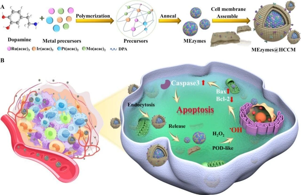癌症治疗领域始终在寻求更精准、更强大的武器,而近年来兴起的纳米酶技术便是其中备受瞩目的新星。纳米酶兼具纳米材料的物理化学特性与天然酶的催化功能,理论上能通过催化肿瘤微环境内的特定反应,实现高效低毒的治疗。然而,传统纳米酶在实战中仍面临两大难题:催化效率有限,难以产生足够强的杀伤力;以及缺乏精准的“导航”能力,易误伤正常组织。最近,一项发表于《Chemical Engineering Journal》的研究提出了一种巧妙策略,通过融合两种前沿概念——中熵合金与同源细胞膜仿生伪装——构建出一种新型靶向催化纳米治疗系统,为破解上述难题提供了创新方案。