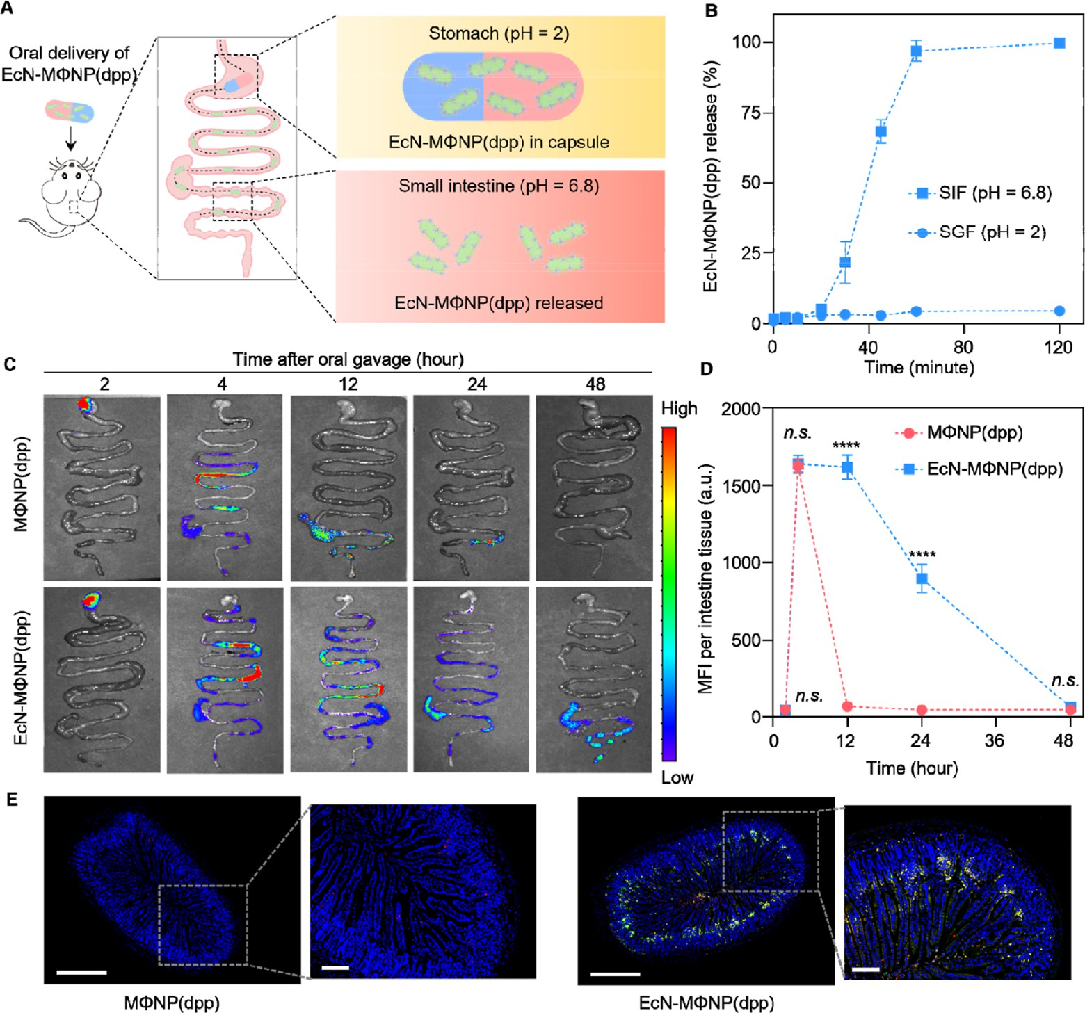 更重要的是,这些装载了酶的膜包纳米颗粒通过无铜点击化学反应,被共价连接到益生菌大肠杆菌Nissle 1917的表面。这一设计使纳米颗粒能够“搭乘”益生菌这艘天然航船。益生菌本身具有定植肠道、增强屏障、调节免疫的特性,同时还能作为一种高效的生物载体,将治疗性纳米颗粒富集并锚定在小肠黏膜上。实验证实,这种生物杂化体系显著延长了纳米颗粒在肠道内的停留时间,从普通纳米颗粒的短暂停留延长至24小时以上。