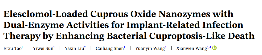 由细菌生物膜定殖介导的植入物相关感染仍是导致骨科假体失败的主要原因。虽然传统高剂量抗生素方案临床疗效有限,常需清创后更换假体,但此类干预给患者带来了巨大的心理和经济负担。为应对这一挑战,通过将铜氧化物纳米颗粒(Cu 2 O NPs)与铜离子团 elesclomol(ES)整合,工程化了具有双酶活性的 ES@Cu 2 O 纳米酶,旨在通过增强铜管毒素样死亡来对抗植入相关感染。ES@Cu 2 O 纳米酶利用过氧化物酶样(POD-like)活性催化内源性过氧化氢(H 2 O 2)转化为活性氧(ROS),在生物膜微环境中产生强劲的氧化浪涌。同时,ES@Cu 2 O 的谷胱甘肽过氧化物酶样(GSH‐Px 样)活性有效消耗过表达的谷胱甘肽(GSH),从而提升 ROS 介导的治疗效果。值得注意的是,ES 会加剧异常的细胞内 Cu 2+积累,加剧类似丙烯瘤贮积症的死亡。与 Cu-2O 处理组相比,ES@Cu 2O 处理组在体外展现出显著更强的抗菌和生物膜消除能力。RNA 测序(RNA-seq)显示,在 ES@Cu 2 O 处理组中,关键的能量代谢途径,包括 TCA 循环、丙酮酸代谢和氧化磷酸化,相较于 Cu-2 O 处理组显著抑制,支持 ES 介导的 Cu 2+过载强力增强铜-磷酸化样死亡的机制。 在体内,ES@Cu 2 O 在小鼠植入相关感染模型中表现出优异的抗菌和修复效果,而生物安全评估证实其全身毒性可忽略不计。总体而言,本研究显示,具有双酶活性的 ES@Cu 2 O 纳米酶通过增强类似蜂巢病的死亡,能够强健地消除生物膜并消灭植入相关感染中的定植细菌,提出了一种具有显著临床转化潜力的新治疗策略。