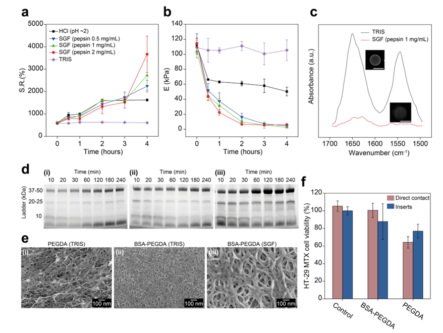 BSA-PEGDA水凝胶在胃类模拟环境中的膨胀、降解、结构分析及生物相容性。(a) BSA-PEGDA水凝胶在37°C处4小时内在TRIS、HCl(pH ∼2)和SGF(胃蛋白酶0.5、1, 2 mg/mL,pH ∼2)中的膨胀比(SR,百分比)。在盐酸中,SR增加2小时后稳定。在SGF中,盐氨酸(盐酸)中SR显著上升,但初期较盐酸(pH ∼2)为低,因为胃蛋白酶降解BSA,降低水分吸收。较高的胃蛋白酶浓度会降低初期肿胀,但由于水凝胶侵蚀,4小时后SR会达到最高。在TRIS中,SR保持稳定。(b) BSA-PEGDA水凝胶在37°C的压缩杨氏模量(E, kPa)在TRIS、HCl(pH ∼2)和SGF(胃蛋白酶0.5, 1, 2 mg/mL, pH ∼2)中表现。30分钟时,压缩杨的模量在SGF和HCl(pH ∼2)中显著下降,而盐酸(pH ∼2)的下降速度也比SGF慢。在SGF中,胃蛋白酶协同加速刚度损失,较高的胃蛋白酶水平加速了刚度的下降。随着时间推移,HCl(pH ∼2)刚度下降速度减缓,稳定在约60 kPa,而SGF中的E在4h后下降约10kPa。TRIS在整个实验中保持稳定E值。(c)在37°C(胃蛋白酶1 mg/mL,pH ∼2)中,对BSA-PEGDA水凝胶中BSA结构进行ATR FTIR光谱分析,培养4小时后。与TRIS组相比,酰胺I峰(约1650 cm−1)和酰胺II峰(约1550 cm−1)显著减少,表明酶消化破坏了BSA的二级结构。ANS作为疏水荧光探针,与BSA的疏水区域结合,从而能够灵敏地检测蛋白质构象变化和降解。插入的ANS荧光图像显示胃蛋白酶强度降低,表明疏水区暴露减少,进一步证实了BSA在水凝胶网络中的降解。比例尺:8毫米。(d) SDS-PAGE分析监测了在37°C下4小时内在SGF下BSA的降解和水凝胶释放情况。初级BSA带强度(37–50 kDa和<10 kDa)随时间递增,表明酶促消化和肽从水凝胶基质中逐步释放。(e) TRIS中PEGDA(200 mM)和BSA-PEGDA(2–100 mM)水凝胶的冷冻SEM与SGF(蛋白酶1 mg/mL,pH ∼2)在37°C下4小时的处理后BSA-PEGDA形成。PEGDA(TRIS)表现出无序且大孔隙结构;BSA-PEGDA(TRIS)显示均匀的孔隙度。在SGF中,BSA-PEGDA降解,孔隙变大,网络较松散且部分破损。(f) 利用分泌黏液的人肠上皮细胞系HT29-MTX,在直接和间接(半透插入)接触条件下培养7天后,对BSA-PEGDA(2–100 mM)和PEGDA(200 mM)水凝胶进行细胞相容性评估。通过MTT测定法定量了细胞存活率。BSA-PEGDA和PEGDA水凝胶均表现出高细胞相容性,分别保持细胞存活率超过80%和约70%,证实其生物相容性极佳(见图S3)。所有测量均在n=3独立的情况下进行