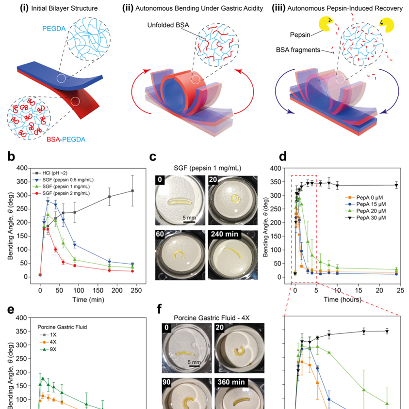 这期《Advanced Materials》封面文章展示了一项前沿创新:一种能听懂“胃的语言”的智能水凝胶。以色列理工学院的研究团队巧妙地利用牛血清白蛋白(BSA)对胃酸和胃蛋白酶的双重响应特性,结合3D打印技术,制造出了一种双层结构水凝胶驱动器。在胃的酸性环境下,蛋白质结构变化驱动水凝胶迅速弯曲变形,完成抓取动作;随后,胃蛋白酶像一把“生物钥匙”,逐步降解蛋白质网络,使材料软化并恢复原状,实现自主的“抓放”循环。整个过程完全由体内固有生化信号控制,无需任何外部干预。
