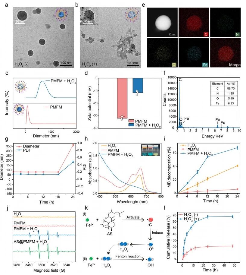 PMFM 胶束的表征。(a,b) PMFM 胶束在过氧化氢(200 mM)作用下的TEM图像(a)和 PMFM 胶束。(c,d) 通过DLS在173°C下测定的 PMFM 胶束在有或无过氧化氢(200 mM)存在时的粒径分布(c)和 ζ 电位(d)。(e,f) PMFM 胶束的 HAADF -STEM图像(e)和EDS元素分析(f)。(g) 纳米颗粒尺寸和PDI在有或无过氧化氢存在时的变化。(h,i) UV−vis光谱(h)和MB在有或无过氧化氢(200 mM)存在时的分解速率(i)。(j) PMFM 和AS@ PMFM 在有或无过氧化氢存在时的ESR光谱。(k) Fe2+与AS协同作用产生ROS的过程。(l) AS@ PMFM 在有或无过氧化氢存在时的体外AS累积释放。
