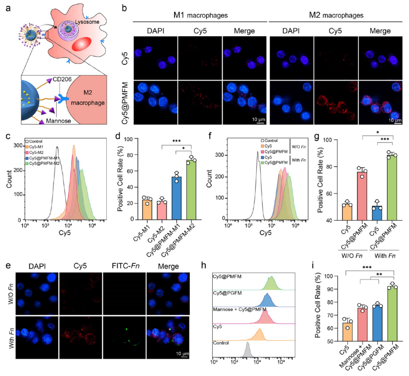 M2型巨噬细胞特异性内化过程。(a) AS@ PMFM 通过甘露糖受体介导的内吞途径进入M2型巨噬细胞。(b−d) CLSM 图像(b)及流式细胞术分析(c,d)显示M1型或M2型巨噬细胞与游离Cy5或Cy5@ PMFM 共孵育3小时后的结果。(e−g) CLSM 图像(e)及流式细胞术分析(f,g)显示未感染或Fn感染巨噬细胞与Cy5@ PMFM 共孵育3小时后的结果。(h,i)流式细胞术分析显示Fn感染巨噬细胞经不同处理3小时后的结果。数据以均值±标准差表示(n=3)。***p<0.001,**p<0.01,*p<0.05。