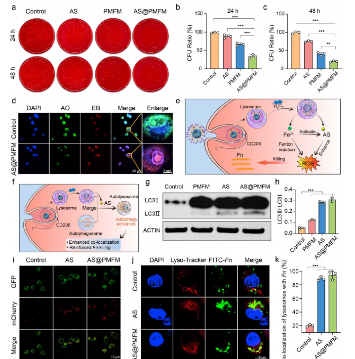 自噬激活驱动的细胞内抗菌活性。(a−c)菌落平板图像(a)及Fn在不同处理24小时(b)和48小时(c)后的 CFU 比。(d)AS@ PMFM 处理后Fn的AO和EB荧光染色。(e)AS@ PMFM 清除细胞内Fn的流程示意图。(f)AS@ PMFM 激活巨噬细胞自噬的机制示意图。(g,h)不同处理后RAW264.7细胞的蛋白质印迹(g)和蛋白定量(h)。(i)不同处理后自噬体-溶酶体融合的 CLSM 图像。(j)不同处理后溶酶体与Fn共定位的 CLSM 图像。(k)溶酶体与Fn共定位的百分比。数据以均值±标准差表示(n=3)。***p<0.001,**p<0.01。