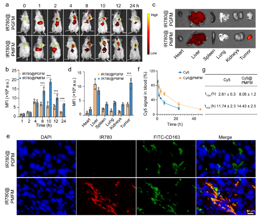 体内生物分布与药代动力学测定。(a,b) 通过尾静脉注射至CT26荷瘤小鼠后不同时间点的IR780@ PGFM 与IR780@ PMFM 胶束生物分布(a)及IR780荧光强度定量(b)。(c,d) 给药24小时后离体器官及肿瘤的成像(c)与IR780荧光定量(d)。(e) IR780@ PGFM 或IR780@ PMFM 胶束与M2巨噬细胞的体内共定位。(f) 游离Cy5与Cy5@ PMFM 胶束的药代动力学。(g) Cy5与Cy5@ PMFM 的药代动力学指标(t1/ 2α :药物在血液中的分布半衰期,t1/ 2β :药物在血液中的消除半衰期)。数据以均值±标准差表示(n=3)。***p<0.001。