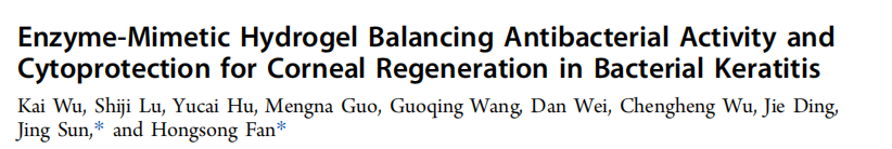 该研究以题为“Enzyme-Mimetic Hydrogel Balancing Antibacterial Activity and Cytoprotection for Corneal Regeneration in Bacterial Keratitis”发表在ACS Nano上。