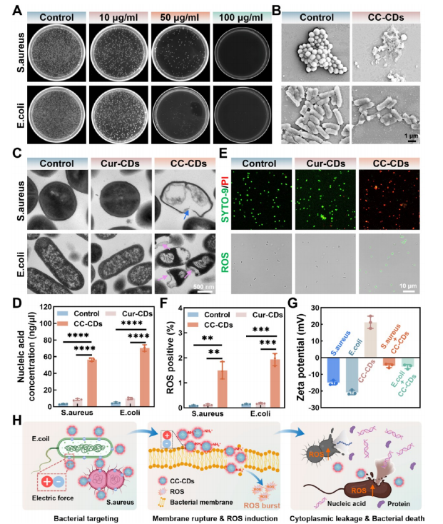 CC-CDs的体外抗菌性能及机制研究。(A) 不同浓度CC-CDs对金黄色葡萄球菌和大肠杆菌的抗菌效果。(B) 100 μg/mL CC-CDs处理前后金黄色葡萄球菌和大肠杆菌的典型SEM图像(比例尺:1 μm)。(C) 未经处理及经Cur-CDs或CC-CDs处理的金黄色葡萄球菌和大肠杆菌的TEM图像。箭头指示细菌细胞质和细胞壁的破坏(比例尺:500 nm)。(D) Cur-CDs或CC-CDs处理后金黄色葡萄球菌和大肠杆菌胞外DNA和RNA外排的细胞质泄漏情况。分析采用非参数单因素方差分析及Tukey多重比较检验。数据以均值±标准差表示(n = 3,****p < 0.0001)。(E) Cur-CDs或CC-CDs处理后金黄色葡萄球菌的活/死细菌染色及细胞内ROS染色(比例尺:10 μm)。(F) 细胞内ROS的定量分析。分析采用非参数单因素方差分析及Tukey多重比较检验。数据以均值±标准差表示(n = 3,**p < 0.01,***p < 0.001)。(G) 大肠杆菌、金黄色葡萄球菌、CC-CDs及处理后共培养体系的Zeta电位。数据以均值±标准差表示(n = 3)。(H) CC-CDs抗菌机制的示意图。