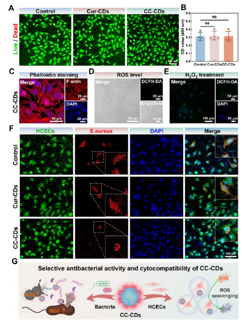 CC-CDs的细胞相容性与选择性杀菌活性。(A)活细胞(绿色)/死细胞(红色)染色及(B)经Cur-CDs或CC-CDs处理3天后培养的人肺上皮细胞(HCECs)存活率定量分析。未处理的培养板作为对照组。采用非参数单因素方差分析结合Tukey多重比较检验进行统计分析。数据以均值±标准差表示(n=4,p>0.05,ns表示无统计学差异)。(C)细胞骨架染色(F-肌动蛋白:绿色; DAPI :蓝色)用于观察HCECs形态。(D)CC-CDs处理后细胞内活性氧(ROS)水平( DCFH -DA染色显示)。(E) DCFH -DA染色评估CC-CDs对H2O2诱导氧化应激的细胞保护作用。(F)细菌-细胞共培养共聚焦图像: HCECs(DiO,绿色),金黄色葡萄球菌(S. aureus,DiD,红色),细胞核( DAPI ,蓝色)。插图:虚线区域的高倍放大视图。(G)CC-CDs选择性杀菌机制示意图。