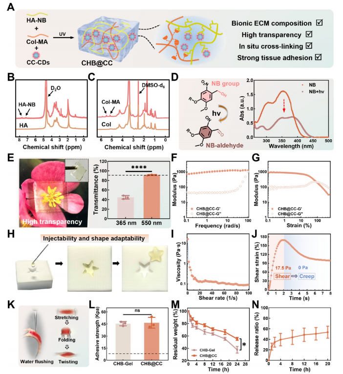 光激活粘合剂 CHB @CC水凝胶的制备与表征。(A) CHB @CC水凝胶构建示意图。(B,C) 分别为(B) HA-NB(溶剂:D2O)和(C) Col-MA(溶剂:DMSO-d6)的1H NMR谱图。(D) NB基团的光响应结构转变及对应的UV-Vis光谱变化。(E) 高透明度 CHB @CC水凝胶的目视观察与透射率测量。虚线表示正常人角膜的透射率。数据分析采用独立样本t检验。数据以均值±标准差表示(n=3,****p<0.0001)。(F,G) 粘弹性分析包括(F) 频率扫描和(G) 应变幅度扫描。(H) 数字照片展示可注射性与形状适应性。(I) 剪切粘度曲线。(J) 通过剪切与蠕变测试模拟人类眨眼动作。(K) 猪皮粘附性能经水冲洗、拉伸、折叠及扭转测试。(L) 通过搭接剪切粘附试验测得的粘附强度统计。虚线表示市售密封剂的粘附强度值。数据分析采用独立样本t检验。数据以均值±标准差表示(n=3,p>0.05(ns))。(M) CHB -Gel与 CHB @CC的降解率。数据分析采用独立样本t检验。数据以均值±标准差表示(n=3,*p<0.05)。(N) CHB @CC水凝胶中CC-CDs的累积释放曲线。