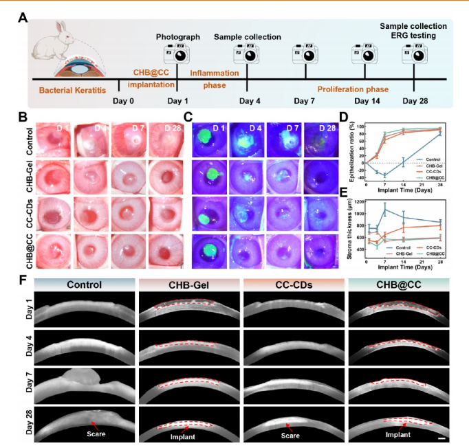 CHB @CC水凝胶在金黄色葡萄球菌感染角膜缺损模型中的体内治疗效果。(A)模型建立、给药及监测流程示意图。(B)裂隙灯照片及(C)治疗后第1、4、7、28天角膜钴蓝-荧光素染色结果。(D,E)角膜上皮化程度(D)与基质厚度(E)的定量统计结果。数据以均值±标准差表示(n=5)。(F)植入后不同时间点兔角膜前节光学相干断层扫描(AS-OCT)图像。红色虚线标示植入物位置。比例尺:500 μm 。