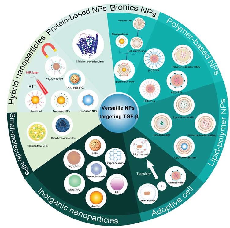 多种纳米颗粒靶向TGF-β的示意图。NPs:纳米颗粒;NIR:近红外;PTT:光热治疗;PEG:聚乙二醇;PEI:聚乙烯亚胺;AuNPs:金纳米颗粒;TiO2:二氧化钛纳米颗粒;Nano NiO:氧化镍纳米颗粒;MSN:介孔硅纳米颗粒;HES:羟乙基淀粉;PLA:聚乳酸;β-CD-HA:透明质酸-醛-单取代β-环糊精。