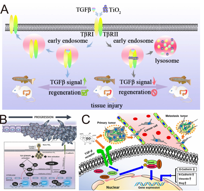 无机纳米颗粒在TGF-β信号调控中的双面特性。(A) TiO2纳米颗粒抑制上皮-间质转化(EMT)。经授权自[140]。版权2018,美国化学学会。(B) TiO2纳米颗粒诱导肠上皮癌细胞迁移和侵袭。经授权自[142]。版权2018,约翰·威利与儿子公司。(C) 氧化石墨烯纳米片通过促进TGF-β信号依赖的EMT促进癌症转移。经授权自[146]。版权2020,美国化学学会。