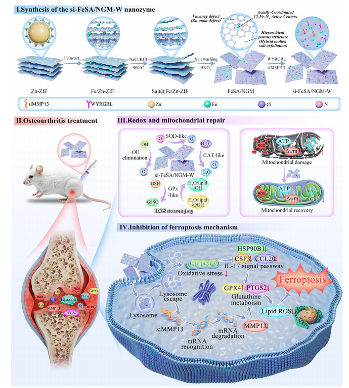 骨关节炎的进展与软骨细胞内铁死亡密切相关——活性氧堆积、谷胱甘肽耗竭、GPX4失活,最终导致线粒体崩解和基质降解。广西医科大学与中科院生物物理所团队在《Advanced Materials》发表研究,他们用混合熔盐剥离策略,将Zn-ZIF前体转化为超薄二维氮掺杂石墨烯纳米网,并在其上锚定不对称配位的Fe-N4-Cl单原子位点,再偶联软骨靶向肽WYGRGL和MMP13的siRNA,构建了一种名为si-FeSA/NGM-W的多功能纳米酶。