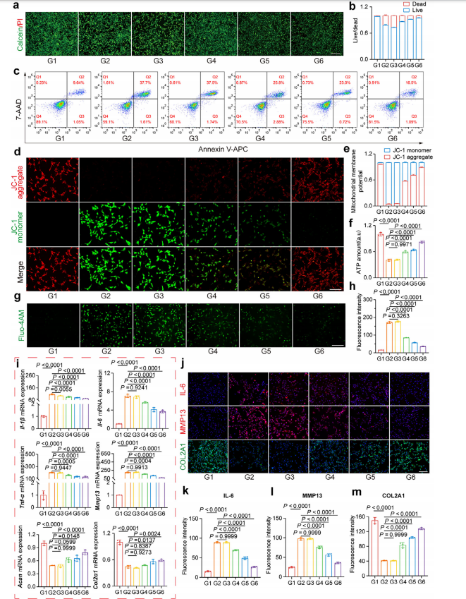 这个结构设计的精妙之处在于:二维多孔纳米网让铁单原子高度暴露,Fe-N4-Cl的不对称配位诱导晶格应变和缺陷富集,加速电子转移,降低反应能垒。DFT计算显示,Fe的d带中心上移,与氧中间体的杂化增强,使得SOD、CAT和GPx三种酶活协同提升——既能将超氧阴离子转化成过氧化氢,又能把过氧化氢分解成水,还能清除羟基自由基,相当于给软骨细胞装了一套完整的抗氧化流水线。体外实验里,8微克/毫升的si-FeSA/NGM-W把H₂O₂诱导的活性氧打掉64.5%,线粒体膜电位恢复91.7%,IL-1β和MMP13的表达被明显摁住,GPX4被拉起来。转录组测序揭示,这背后是IL-17通路被抑制、谷胱甘肽代谢被激活。