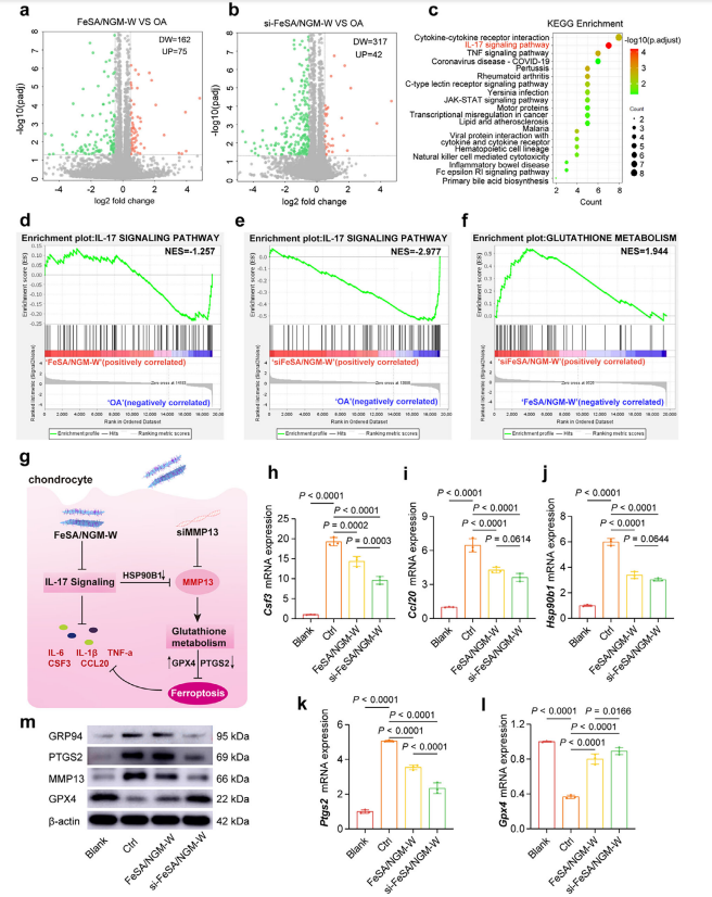 关于SAzymes缓解骨关节炎潜在生物学机制的研究。(a)火山图显示FeSA/ NGM -W组与OA组mRNA表达变化。(b)火山图显示si-FeSA/ NGM -W组与OA组mRNA表达变化。(c)交叉基因的 KEGG 富集结果。(d,e)IL-17通路 GSEA 图。(f)谷胱甘肽代谢 GSEA 图。(g)FeSA/ NGM -W与si-FeSA/ NGM -W治疗OA的潜在分子机制。(h-j)IL-17通路相关基因的qPCR分析。(k,l)铁死亡相关基因的qPCR分析结果。(m)以肌动蛋白为内参的软骨细胞中IL-17通路及铁死亡相关蛋白的Western blot检测。数据以均值±标准差表示(n=3)。P值通过单因素方差分析评估并用星号标记。