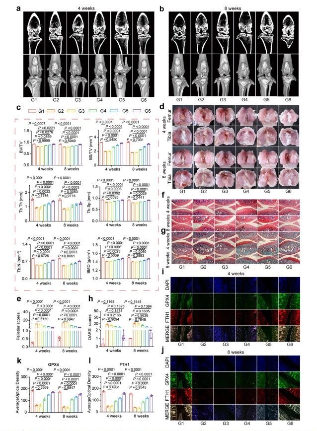 OA疗法的体内效应。(a,b) 微CT图像展示了治疗后4周和8周时相应治疗的效果。图像以二维形式展示在顶部,三维形式展示在底部。(c) 通过微CT定量分析评估大鼠胫骨小梁质量。用于骨评估的定量分析参数包括:骨体积分数(BV/TV)、骨表面密度(BS/BV)、小梁骨数量(Tb.N)、小梁骨结构厚度(Tb.Th)。