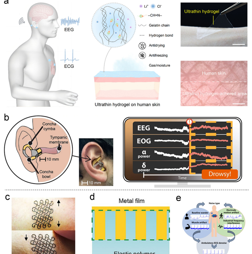 电生理传感器的设计与应用。(a) 超薄水凝胶电极进行无线心电图(ECG)和脑电图(EEG)监测的示意图。经许可转载 [90]。版权所有 2025,美国科学促进会。(b) 一种佩戴在耳部的脑电图设备可以舒适且隐蔽地全天佩戴,用于记录耳道内的神经信号、检测困倦状态并提供实时反馈。经许可转载 [91]。版权所有 2024,施普林格自然。(c) 一张展示使用导电材料开发贴合电极界面的照片。经许可转载 [92]。版权所有 2023,施普林格自然。(d) 具有微/纳米结构电极的示意图。经许可转载 [93]。版权所有 2016,Wiley。(e) 可穿戴心电图噪声抑制的整体流程图。经许可转载 [94]。版权所有 2025,爱思唯尔