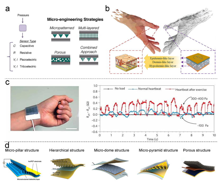 压力传感器的设计与应用。(a) 常见类型的压力传感器基于电容、电阻、压电和摩擦电机制工作。经许可转载 [119]。版权 2020, Wiley。(b) 将仿皮肤压力传感器集成到机器人手中,可实现精确的物体识别。经许可转载 [121]。版权 2020, 美国科学促进会。(c) 一种柔性且高灵敏度的应变片传感器被贴合在手腕上,可在正常和运动状态下准确测量脉搏信号。经许可转载 [122]。版权 2012, Springer Nature。(d) 常用于提高压力传感器灵敏度的结构设计。经许可转载 [124]。版权 2024, Elsevier