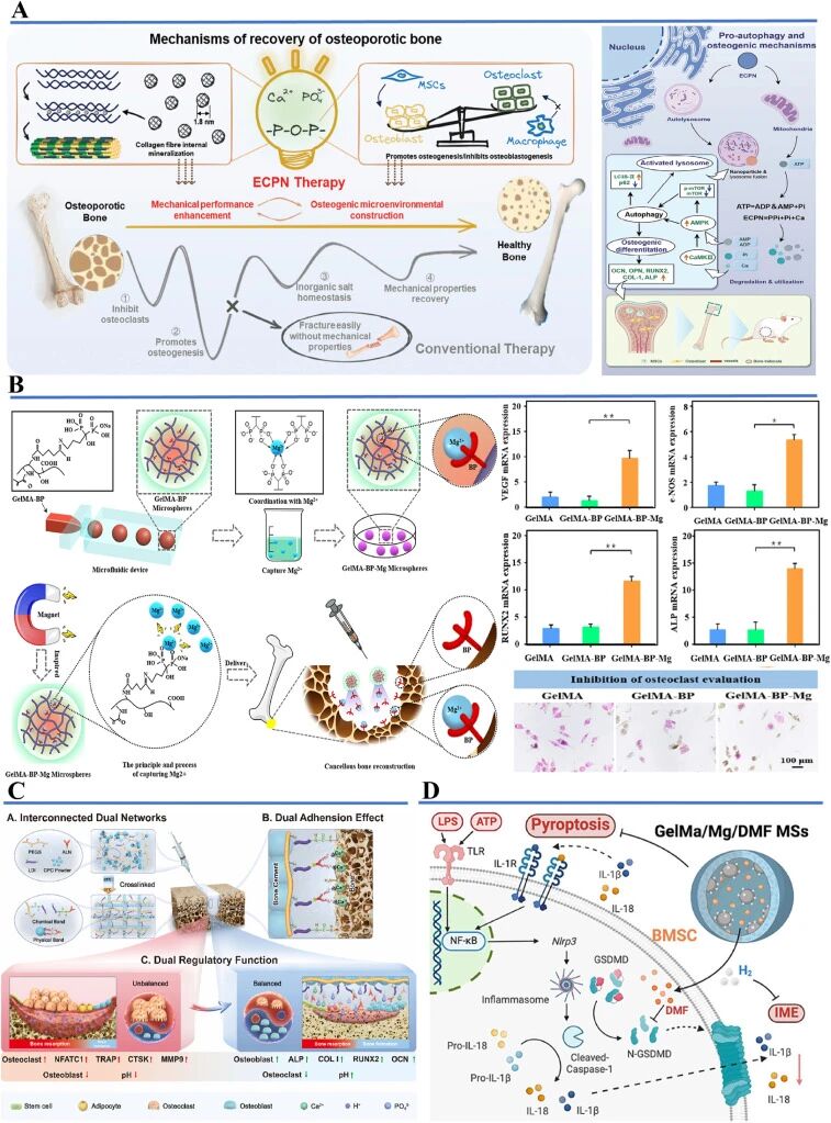 1. 以骨骼微环境内在功能组分为核心,构建四大类新兴生物材料分类体系,包含离子释放系统、代谢物系统、细胞外基质模拟系统、细胞因子负载系统;