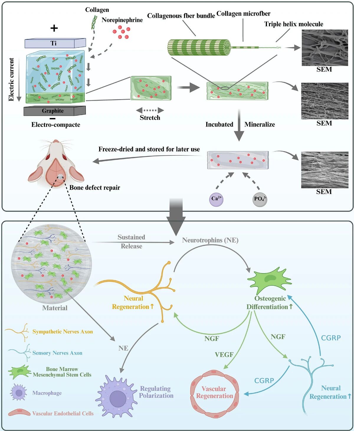 关键大小骨缺损的有效再生需要骨生成、神经生成、血管生成和免疫调节之间的整合协调——但大多数生物材料未能同时处理这些维度。这里开发了一种负荷去甲肾上腺素、仿生矿化电致密胶原支架(NE-MEC),整合结构各向异性和持续生化活性,促进骨骼整合修复。NE-MEC 通过等电聚焦、机械拉伸和非晶磷酸钙矿化制造,模拟原生骨骼的组成和有序排列,保持胶原纤维特有的 D 周期性。矿化电致密胶原本身即可促进大鼠骨髓间充质干细胞的骨生成分化。加入去甲肾上腺素后,这种骨诱导效应进一步增强,伴随着神经生长因子的早期上调,支持周围神经修复并诱导降钙素基因相关肽(CGRP)的产生。反过来,CGRP 增强了骨生成分化和新生血管形成。同时,NE-MEC 还刺激再生骨组织中的血管内皮生长因子 A 表达,并调节巨噬细胞极化。这些效应共同建立了再生回路,协调整骨、神经生成、血管生成和免疫调节过程,为协同骨骼修复提供了有前景的生物材料平台。
