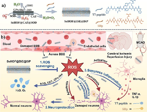 无金属氢键有机框架(HOFs)是通过有机构件氢键形成的多孔材料,在生物医学应用中具有优异的生物相容性和酶兼容性。然而,利用 HOFs 制造用于脑缺血再灌注损伤(CIRI)治疗的多酶级联抗氧化纳米酶仍具挑战性。这里合成了含硒的纳米 HOFs(SeHOFs),作为谷胱甘肽过氧化物酶模拟体,原位包裹超氧化物歧化酶(SOD)和过氧化氢酶(CAT),形成混合级联抗氧化系统(SeHOF@CAT@SOD)。SeHOFs 表现出增强的催化活性,保持酶功能,并能保护其免受温度、蛋白水解和变性。无金属纳米酶展现出优异的生物相容性和级联催化效能,能够清除活性氧物种,并在体外减少细胞凋亡和铁剥坏。肽修饰增强梗塞部位积累,有效减少 CIRI 模型中的梗塞体积、氧化应激、神经元凋亡、铁消亡和炎症。本研究强调了纳米 HOF 作为在缺血性卒中治疗中先进治疗性纳米酶开发支架的潜力。