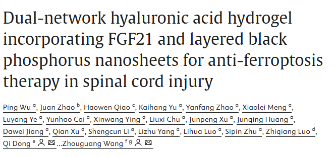 Journal of Controlled Release | 结合 FGF21 和分层黑磷纳米片的双网透明质酸水凝胶,用于脊髓损伤抗铁剥落治疗