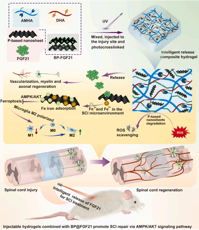 在脊髓损伤治疗领域,研究人员持续探索能够促进神经再生与修复的新型生物材料。最近,一项发表在《Journal of Controlled Release》的研究提出了一种创新的双网络透明质酸复合水凝胶,其中整合了成纤维细胞生长因子21(FGF21)与层状黑磷纳米片,旨在通过抗铁死亡机制促进脊髓损伤后的功能恢复。