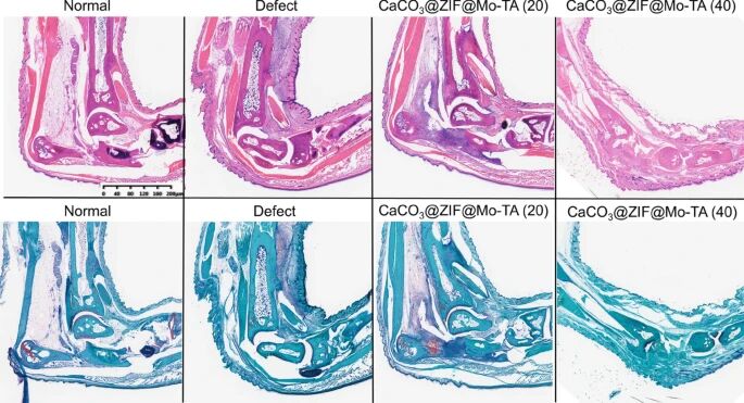 骨关节炎是一种以软骨退化、软骨下骨骼重塑及慢性炎症为特征的退行性关节疾病,现有治疗难以触及疾病根本机制。本研究构建了CaCO₃层包覆的ZIF-8复合钼纳米酶(CaCO₃@ZIF-8@Mo-TA),通过多种技术表征该纳米材料,并在骨关节炎大鼠模型中探究其治疗潜力。研究发现该纳米酶可通过调控关键信号通路发挥抗氧化与抗炎作用,为骨关节炎治疗提供了新的潜在策略。