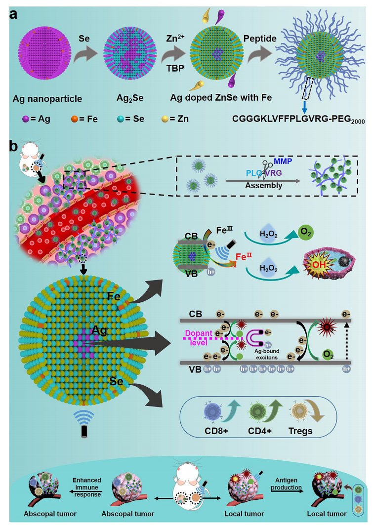 针对这些问题,研究人员最近开发了一种新型纳米平台,将银掺杂的硒化锌量子点与原子级分散的表面铁结合,并修饰了可被基质金属蛋白酶切割的自组装肽。这一设计使得纳米颗粒在到达肿瘤部位后,能通过酶触发形成聚集体,显著增强在肿瘤内的滞留。其中,表面三价铁在正常情况下保持稳定,仅在超声波作用下转化为二价铁,从而在肿瘤微环境中触发可控的芬顿反应,产生具有细胞毒性的羟基自由基。与此同时,银的掺杂在量子点内形成了中间能级,有效抑制了激子的非辐射复合,提升了单线态氧的生成效率,增强了声动力学治疗效果。