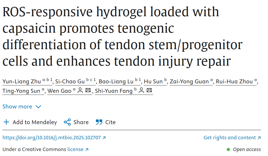 本研究聚焦于解决肌腱损伤后修复质量差、易出现异位骨化等临床难题。团队设计并开发了一种能够响应活性氧(ROS)的功能性水凝胶材料CGT,该材料以辣椒素作为核心生物活性成分。