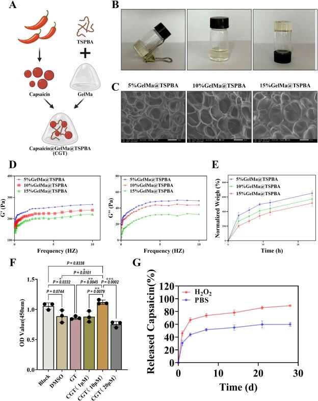 本研究开发的ROS响应型水凝胶实现了生物活性分子的可控释放。与传统水凝胶相比,CGT水凝胶能够对肌腱损伤部位的微环境特异性标志物——活性氧(ROS)产生响应,实现辣椒素的靶向释放。