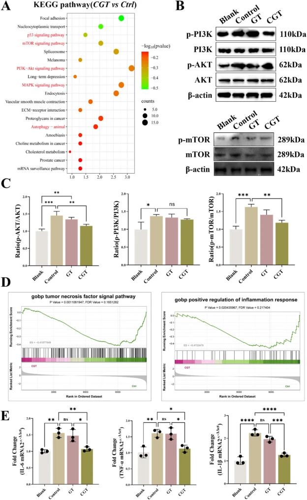 从作用机制角度,研究揭示CGT可能通过抑制PI3K-AKT-mTOR信号通路,减弱促炎细胞因子(IL-6、TNF-α、IL-1β)的分泌,从而调控炎症微环境。