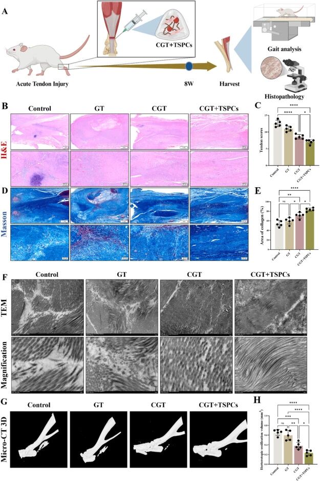 在动物实验层面,研究团队将CGT水凝胶单独或联合外源性TSPCs应用于SD大鼠的跟腱缺损模型。术后8周的评估结果显示,治疗组实现了有序的胶原纤维再生,炎症反应减轻,且有效抑制了异位骨化的形成,同时表现出良好的生物安全性。