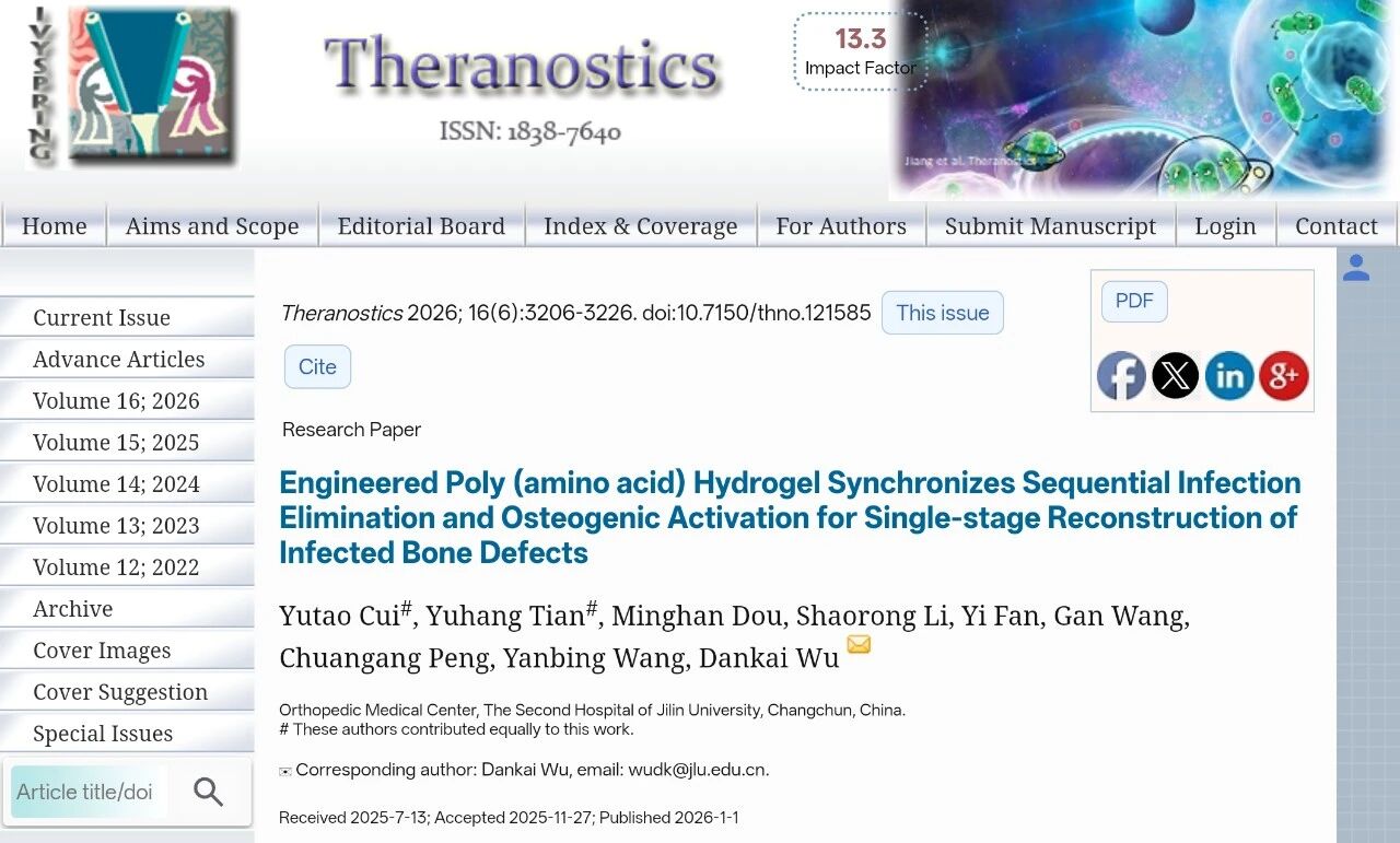 针对感染性骨缺损的治疗挑战,本研究构建具有连续抗菌与成骨激活特性的工程化聚氨基酸水凝胶,通过体内外实验验证其在感染控制与骨缺损修复中的作用,实现该病症的单阶段重建。