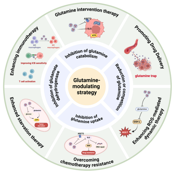 在克服传统治疗阻力方面,纳米策略亦表现突出。通过协同递送谷氨酰胺代谢抑制剂与化疗药物,可降低肿瘤细胞内谷胱甘肽水平,逆转由抗氧化增强导致的化疗耐药。同时,抑制谷氨酰胺代谢能削弱肿瘤的抗氧化防御体系,显著增强基于活性氧的动力学疗法(如光动力、声动力、化学动力疗法)的杀伤效果。其机制在于阻断谷氨酰胺代谢不仅减少了谷胱甘肽的合成,还通过影响NADPH等辅因子的生成,使肿瘤细胞更易遭受氧化损伤。