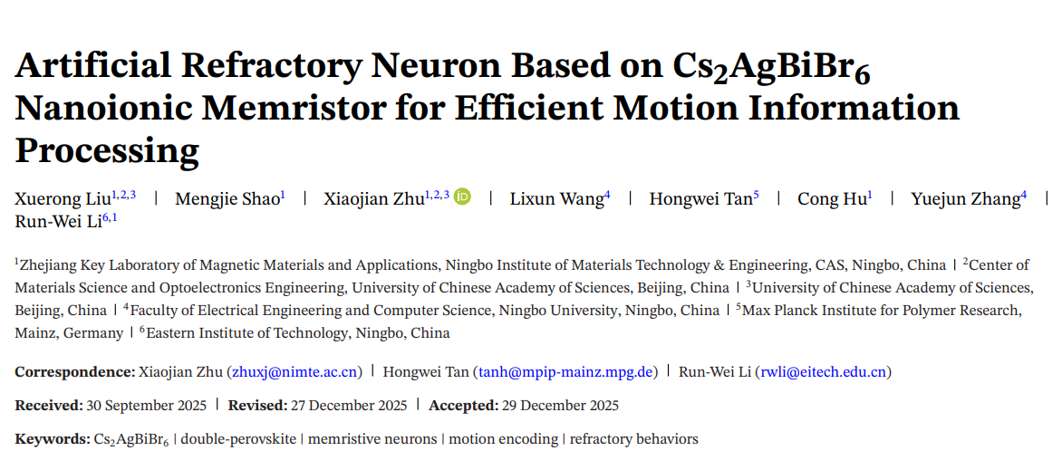 Advanced Materials | 基于 Cs2AgBiBr6 纳米离子唵阻器的人工耐火神经元,实现高效的运动信息处理
