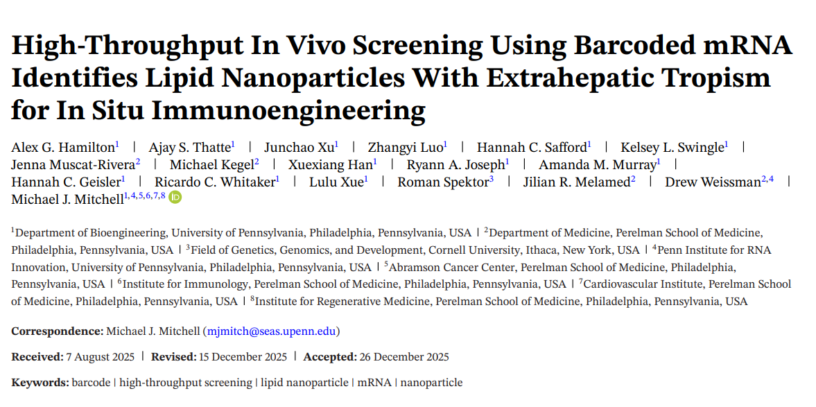 Advanced Materials | 利用条码 mRNA 进行高通量体内筛选,识别具有肝外嗜滋性的脂质纳米颗粒,用于原位免疫工程
