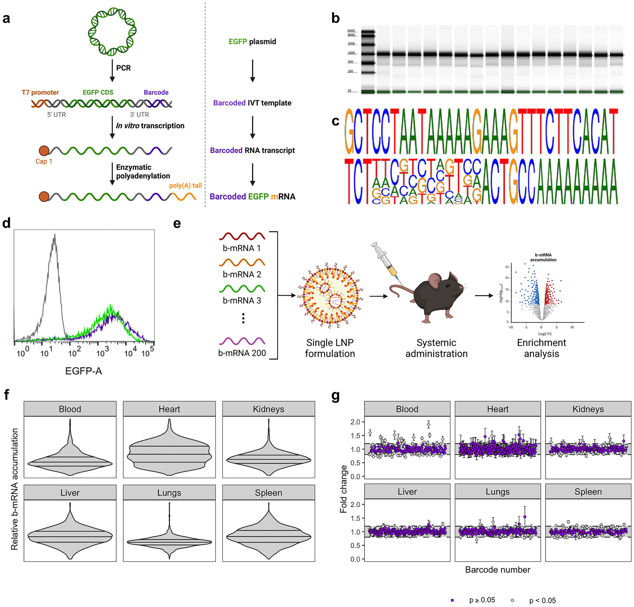 宾夕法尼亚大学Michael J. Mitchell团队近期在《先进材料》上报告了一项重要进展:他们成功开发了一种基于条形码mRNA(b-mRNA)的高通量体内筛选平台,并利用该平台快速鉴定出具有高效肝外靶向能力的新型LNP,显著提升了原位免疫工程化的效率。该技术的核心在于,研究者设计了包含200个12核苷酸条形码序列的mRNA文库,这些条形码经过严格的误差校正优化,确保在二代测序中能够被准确识别与区分。所有条形码mRNA均编码相同的增强型绿色荧光蛋白(EGFP),但其独特的“分子身份证”——条形码序列不同。通过将不同条形码mRNA封装至不同的LNP中,并将这122种LNP组成的混合库一次性静脉注射至小鼠体内,研究者便可借助后续的组织分离、细胞分选及高通量测序,同时追踪每一种LNP在血液循环、肝脏、脾脏、肺脏等不同器官以及各类免疫细胞中的分布与递送情况。