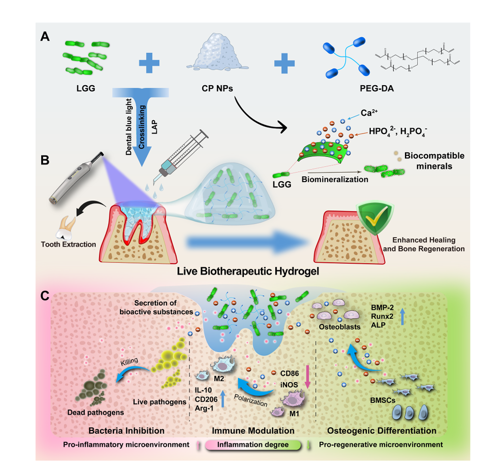 工程活生物治疗水凝胶的示意图,用于促进拔牙后伤口愈合和骨再生。(A)将鼠李糖乳杆菌GG (LGG)和磷酸钙纳米颗粒(CPNPs)掺入可光聚合的聚乙二醇(PEG)基质中,制备可注射的光响应活性生物治疗水凝胶。(B)活体生物治疗水凝胶的生物医学应用,该水凝胶可以注射到牙齿拔牙槽中,并在牙齿蓝光下原位快速交联,以精确地符合牙槽的解剖结构。(C)活的生物治疗水凝胶通过再现窝窝修复的关键阶段,包括病原体抑制、免疫调节和骨再生,在时空上调节局部微环境。