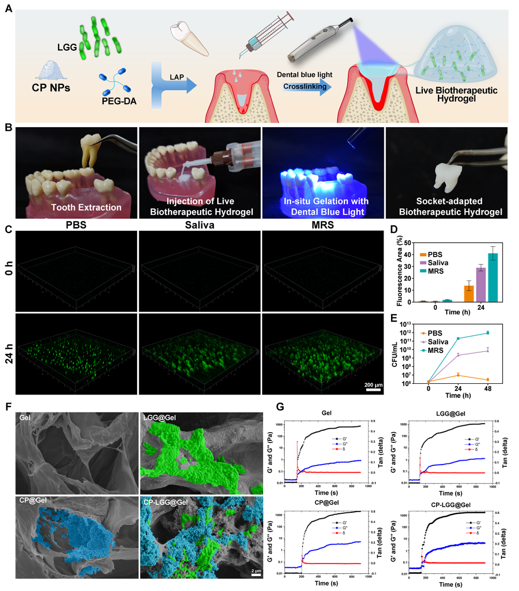活性生物治疗水凝胶的制备与表征。(A)活性生物治疗水凝胶的合成示意图。该系统采用聚乙二醇二丙烯酸酯(PEG-DA)作为光交联聚合物基质,苯基-2,4,6-三甲基苯甲酰膦酸锂(LAP)作为光引发剂包封鼠李糖乳杆菌GG (LGG)和磷酸钙纳米颗粒(CP NPs)。(B)描述活生物治疗水凝胶临床应用的数字图像。拔牙后,将含有LGG和CP NPs的前体溶液混合,注射到牙槽中,使用牙科蓝光原位光聚合。(C)共聚焦显微镜图像显示LGG在PBS、唾液或MRS培养基中孵育24小时后在水凝胶中的分布和活力。比例尺:200μm。(D)不同培养条件下囊化LGG荧光强度和(E)菌落形成单位(CFU)计数的定量分析。(F)冻干水凝胶的SEM图像显示LGG(伪绿色)和CP NPs(蓝色)。比例尺:2μm。(G)水凝胶的流变学分析。