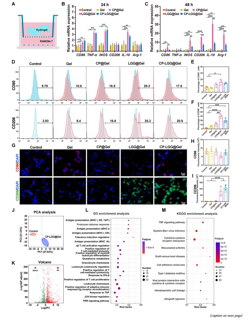 活体生物治疗水凝胶的体外免疫调节作用。(A)使用RAW264.7细胞评估巨噬细胞极化的Transwell共培养系统示意图。(B)共培养24 h和(C)共培养48 h后巨噬细胞极化标记物的定量RT-PCR分析,基因表达水平归一化至对照组。(D)流式细胞术分析,共培养48 h后(E) CD80+(M1巨噬细胞标志物)和(F) CD206(m2巨噬细胞标志物)细胞群的定量。(G)共培养48小时后巨噬细胞CD86(红色,M1标记物)、CD206(绿色,M2标记物)和细胞核(蓝色,DAPI)的代表性免疫荧光图像。比例尺:30+μm。(H) CD86和(I) CD206的荧光强度定量。(J)主成分分析(PCA)显示了对照组和CP-LGG@Gel-treated组之间不同的转录组谱。(K) rna测序结果的火山图,突出了显著上调(红色)和下调(绿色)的基因。(L) CP-LGG@Gel处理巨噬细胞中差异表达基因的基因本体(GO)富集分析。(M)京都基因和基因组百科全书(KEGG)途径分析,确定受处理影响的显著富集信号通路。* * * P < 0.05, P < 0.01, * * * P < 0.001, * * * * P < 0.0001