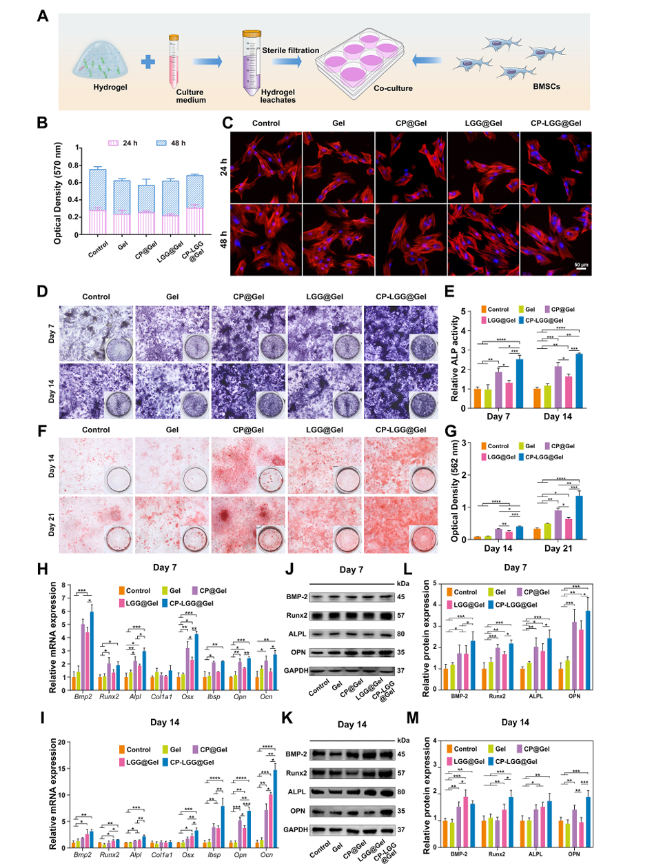生物治疗活性水凝胶诱导骨髓间充质干细胞的增殖和成骨分化。(A)水凝胶提取物与骨髓间充质干细胞共培养示意图。(B)与PBS对照相比,MTT试验显示水凝胶浸出液培养24和48小时后骨髓间充质干细胞的活力。(C)显示骨髓间充质干细胞形态的代表性免疫荧光图像。比例尺:50μm。(D)培养7天和14天后BMSCs的碱性磷酸酶(ALP)染色和(E)碱性磷酸酶的定量活性。(F)第14和21天茜素红S染色和(G)钙结节沉积定量。(H, I) 7天和14天成骨基因表达的rt - pcr分析。(J, K) 7和14 d时关键成骨标志物蛋白的Western blot分析。(L, M) Western blots蛋白表达水平的密度测定。* * * P < 0.05, P < 0.01, * * * P < 0.001, * * * * P < 0.0001。