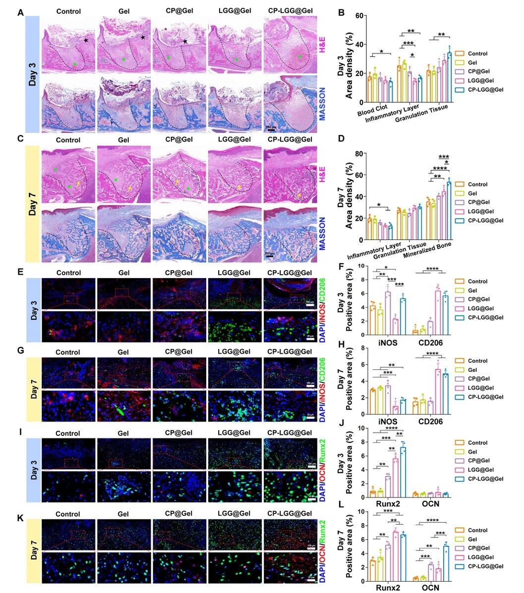 拔牙后第3天和第7天牙槽愈合的组织学评价。(A, C)术后第3天、第7天拔牙槽的H&E染色和马氏三色染色。黑色虚线表示提取缺陷的边界;黑色星形表示炎症层;绿色星号表示肉芽组织,黄色箭头表示新形成的编织骨。(B, D)定量组织形态分析显示拔牙槽内不同组织的比例。(E, G)术后第3天和第7天,缺损区域的代表性免疫荧光图像显示M1 (iNOS,红色)和M2 (CD206,绿色)巨噬细胞标记物,DAPI(蓝色)核染色。(F, H)术后第3天、第7天缺损区iNOS++、Runx2+、CD206+区定量。(I, K)成骨标志物OCN(红色)、Runx2(绿色)免疫荧光染色,DAPI(蓝色)反染。(J, L)反映成骨活性的ocnarea的定量分析。* * * P < 0.05, P < 0.01, * * * P < 0.001, * * * * P < 0.0001