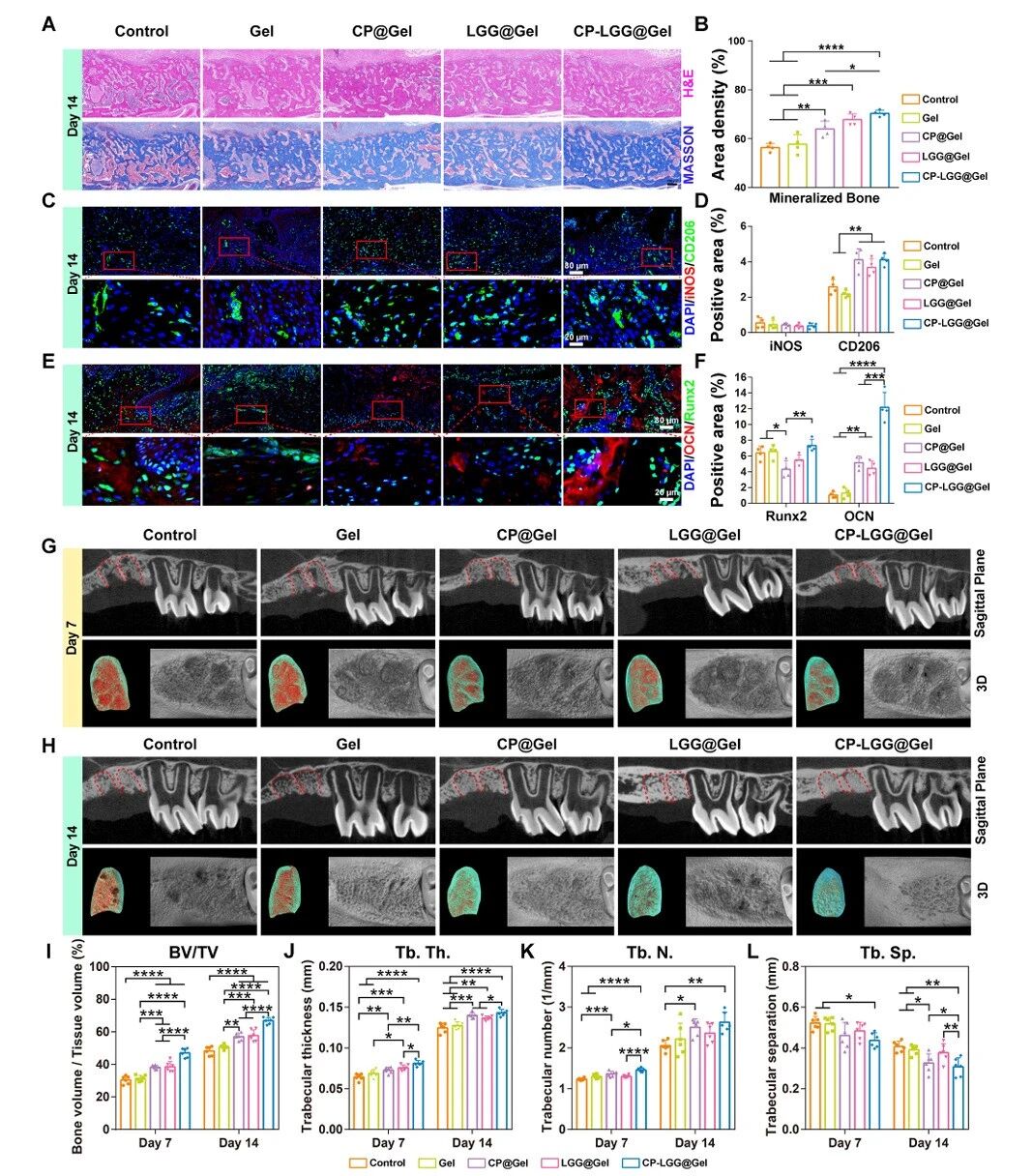 该水凝胶通过多机制协同作用显著促进组织再生:活性益生菌LGG能有效抑制病原菌生长,并通过调控巨噬细胞极化(从促炎的M1型向抗炎促再生的M2型转变)来优化创面免疫微环境。同时,LGG代谢产生的乳酸能促进CP NPs中钙、磷离子的释放,并以其表面蛋白为模板,辅助生物矿化过程,从而显著增强骨髓间充质干细胞的成骨分化与矿化沉积。动物实验证实,该水凝胶能加速软组织愈合,并促进拔牙窝内新生骨小梁的成熟与连接,展现出卓越的促骨再生能力。