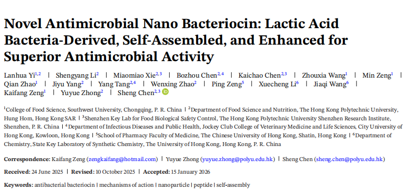 该研究以题为“Novel Antimicrobial Nano Bacteriocin: Lactic Acid Bacteria-Derived, Self-Assembled, and Enhanced for Superior Antimicrobial Activity”发表在Advanced Materials上。