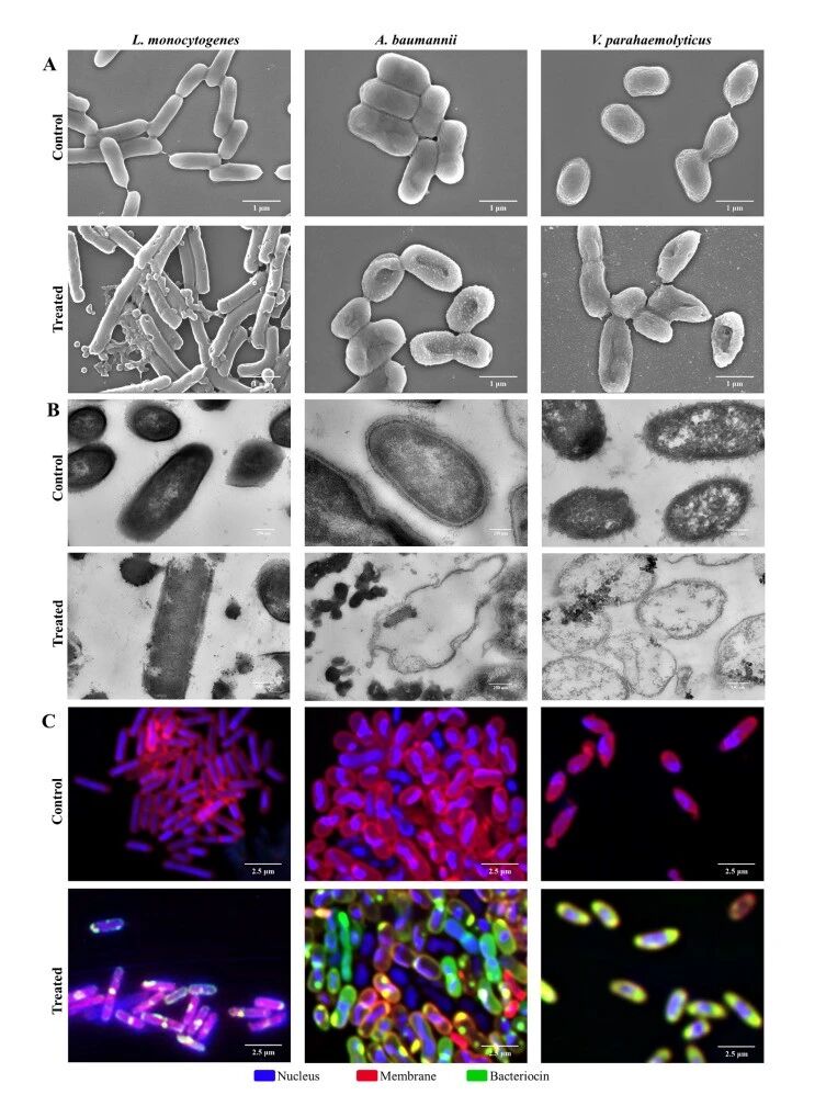 自组装抗菌细菌素纳米颗粒的抗菌活性机制。(A)NAMBs处理导致三种细菌膜损伤致死的扫描电镜(SEM)图像;(B)三种细菌超微结构变化的透射电镜(TEM)图像;(C)NAMBs与三种细菌相互作用作用位点的 CLSM 图像。