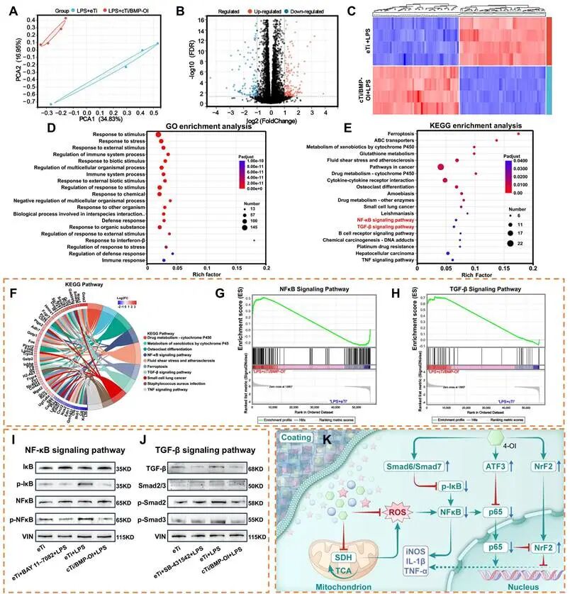 研究突破了传统骨修复材料单纯关注“成骨”的局限,将免疫调节作为促进骨整合的关键前提。4-OI的早期释放能够有效抑制巨噬细胞向促炎的M1表型极化,减轻炎症反应与氧化应激,为后续骨再生创造有利的微环境。