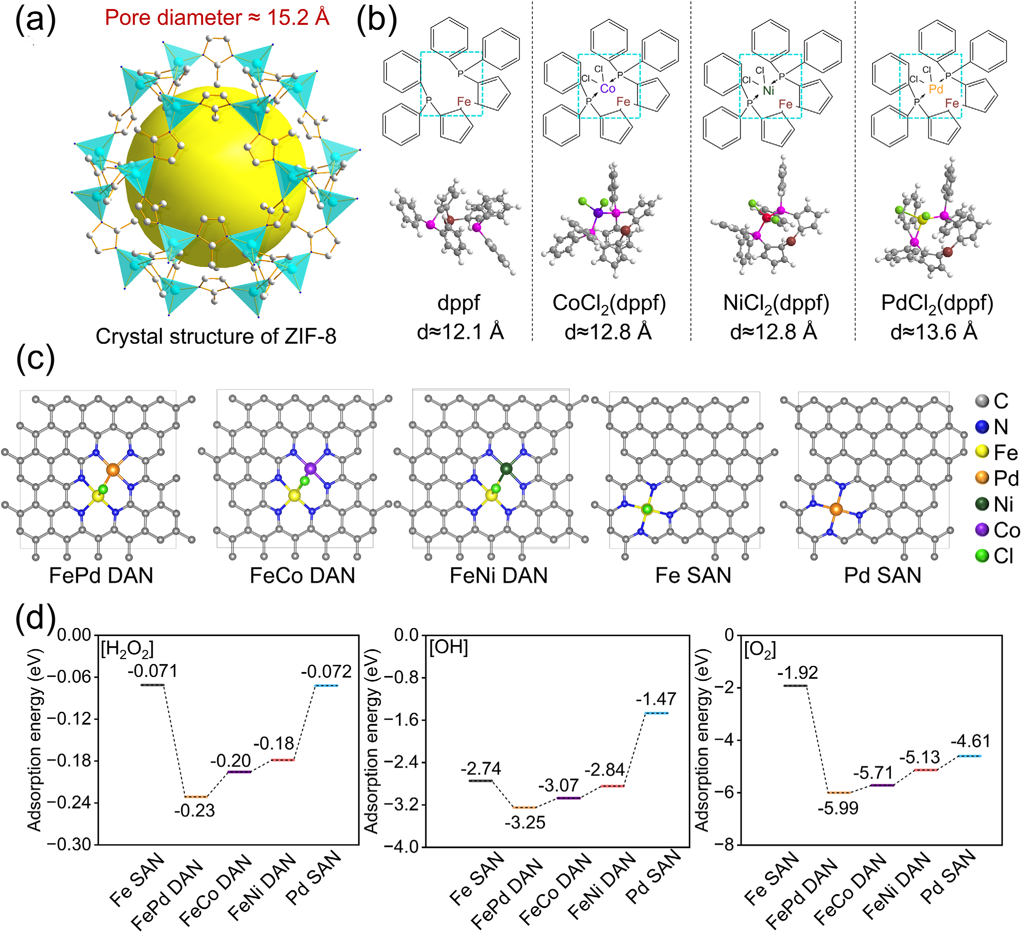 在这项研究中,团队成功设计并制备了一种空间有序的双原子纳米酶o-FePd DAN,它通过模拟天然酶的底物诱导构象锁定机制,实现了高效且动态可调的催化性能。该纳米酶以Cl-FeN₃C-PdN₃为催化中心,在双金属位点的协同作用下,不仅显著增强了对H₂O₂的吸附与活化能力,还借助氯介导的轴向配位建立了动态电子转移通路。原位X射线吸收谱分析进一步表明,在催化过程中Fe与Pd之间会形成桥连结构,促使反应机制由自由基介导的氧化向直接电子转移转变,从而有效模拟了天然双金属酶的SCL效应。